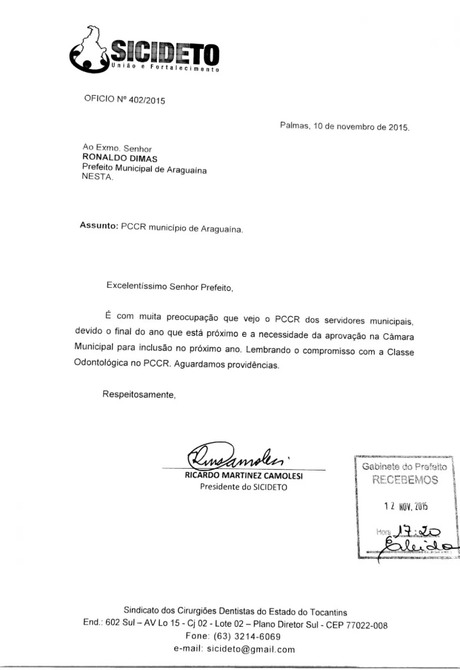 O presidente do Sindicato dos Cirurgiões Dentistas do Estado do Tocantins, Dr. Ricardo Martinez Camolesi, vê com muita preocupação a demora do Prefeito em mandar para a Câmara o projeto de lei que trata do PCCR dos servidores públicos municipais de Araguaína.Por várias vezes já cobrou oficialmente o prefeito municipal e esta semana resolveu novamente oficiar a cobrança, pois o tempo está se esgotando e o projeto de lei não foi para a Câmara; se não for aprovado este ano, o ano que vem não teremos PCCR para os servidores de Araguaína.