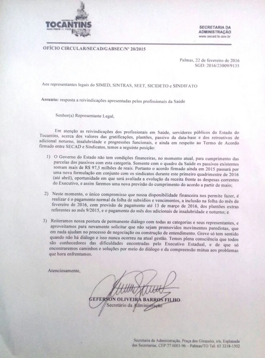 Em atenção as reivindicações feitas pelos profissionais da saúde servidores públicos do Estado do Tocantins acerca dos valores das gratificações, plantões, passivos da data-base e dos retroativos de adicional noturno, insalubridade e progressões funcionais, a SECAD respondeu através de um oficio encaminhado as entidades sindicais que o Governo do Estado não tem condições financeiras, no momento atual, para cumprimento das parcelas dos passivos com esta categoria. Portanto o acordo firmado ainda em 2015 passará por uma nova formulação em conjunto com os sindicatos durante este primeiro quadrimestre de 2016 (até abril).