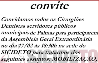 Convidamos você Cirurgião Dentista servidor público municipal para participar da Assembleia Geral Extraordinária a realizar­-se no dia 17/02 ás 18:30h na Sede do Sicideto.