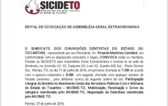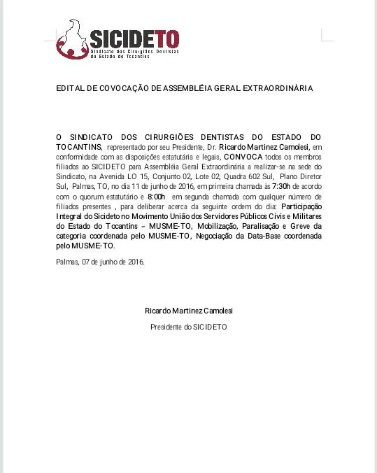 O SINDICATO DOS CIRURGIÕES DENTISTAS DO ESTADO DO TOCANTINS, representado por seu Presidente, Dr. Ricardo Martinez Camolesi, em conformidade com as disposições estatutária e legais, CONVOCA todos os membros filiados ao SICIDETO para Assembléia Geral Extraordinária a realizar-se na sede do Sindicato, na Avenida LO 15, Conjunto 02, Lote 02, Quadra 602 Sul, Plano Diretor Sul, Palmas, TO, no dia 11 de junho de 2016, em primeira chamada às 7:30h de acordo com o quorum estatutário e 8:00h em segunda chamada com qualquer número de filiados presentes , para deliberar acerca da seguinte ordem do dia: Participação Integral do Sicideto no Movimento União dos Servidores Públicos Civis e Militares do Estado do Tocantins – MUSME-TO, Mobilização, Paralisação e Greve da categoria coordenada pelo MUSME-TO, Negociação da Data-Base coordenada pelo MUSME-TO.
