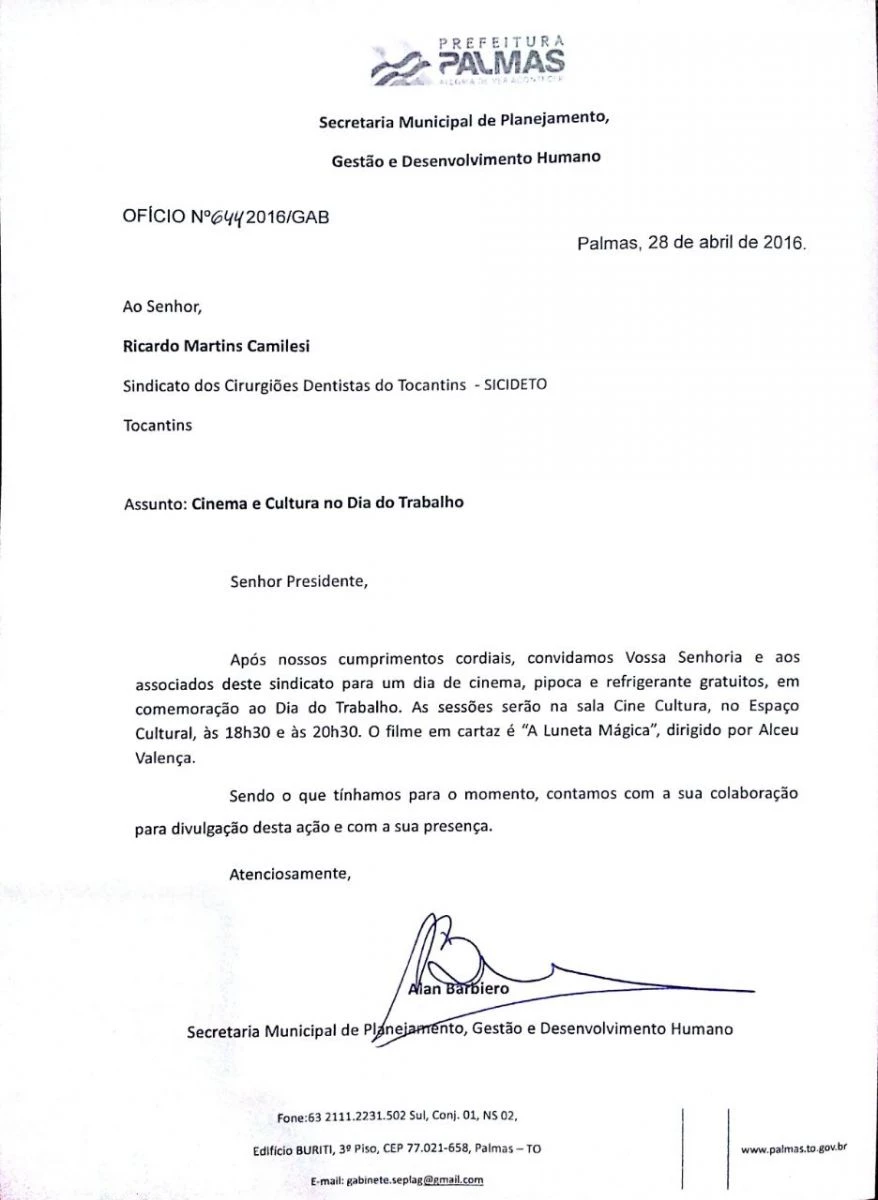 O Sicideto recebeu um oficio do Secretário Municipal de Saúde Alan Barbiero convidando o Presidente do Sicideto e associados para um dia de cinema, pipoca e refrigerante gratuitos, em comemoração ao Dia do trabalho. As sessões serão na sala Cine Cultura, no Espaço Cultural, às 18:30 e 20:30. O filme em cartaz é “ A Luneta Mágica”, dirigido por Alceu Valença.