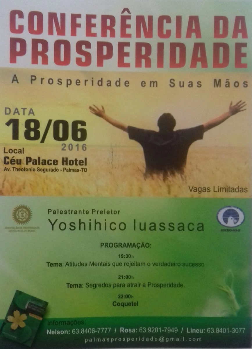 A Prosperidade em suas Mãos Data: 18/06 Local: Céu Palace Hotel, AV Teotônio Segurado - Palmas - TO