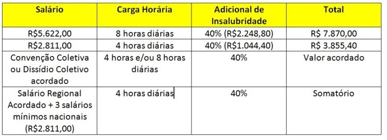 No caso do cálculo do salário de quem trabalha além ou aquém desses limites, deve ser considerado o salário mínimo hora, somado ao adicional de insalubridade em regra, observa-se também o grau máximo de insalubridade que corresponde a 40%, calculado sobre o salário profissional.