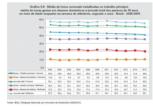 afazeres domésticos para homens são de 50,5hs, enquanto que para mulheres 55,1hs