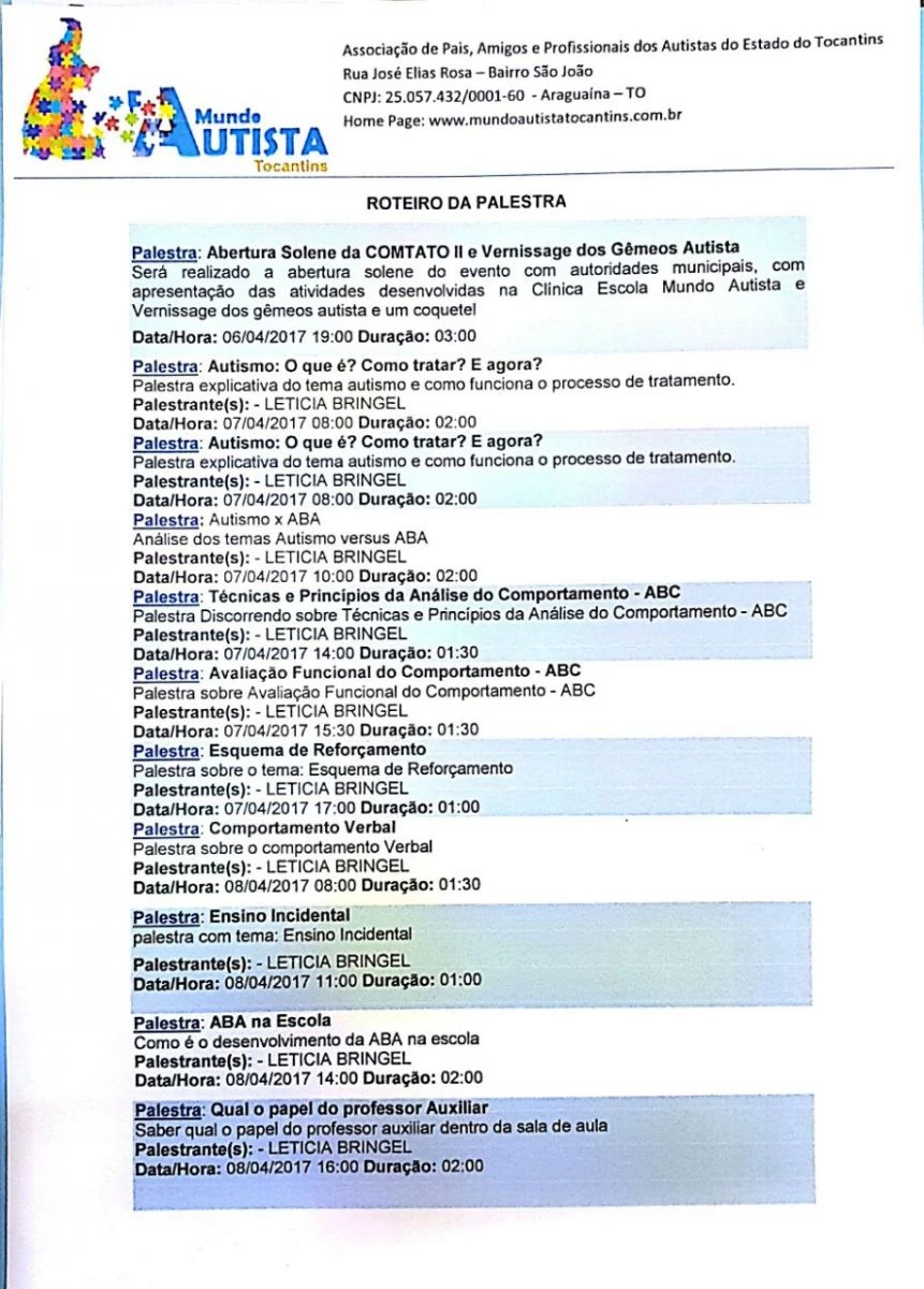 Os temas das palestras serão voltados para ações que auxiliem no atendimento do TEA, técnica, metodos a programação segue abaixo.