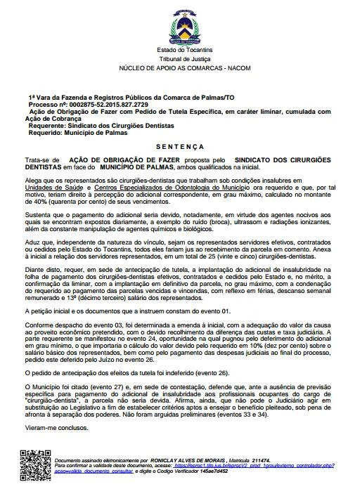 Sobre o processo de insalubridade o juiz determinou prazo até 26/06/17 para defesa, ou seja o Município de Palmas deve recorrer, mas ficou acertado que aqueles que tiverem interesse pelo processo que procurem o Sindicato em até 30 dias.