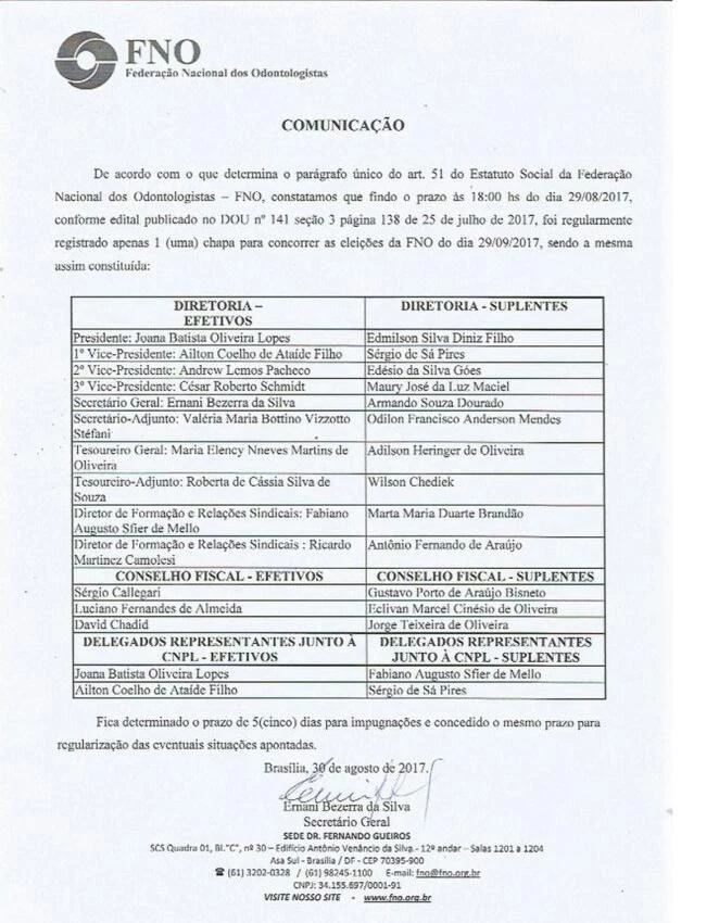 Nesta sexta 29 de setembro 2017, foi realizada na sede da FNO em Brasília - Distrito Federal, a eleição para o quadriênio 2018-2021, da Diretoria da Federação Nacional dos Odontologistas - FNO. Com chapa única de concenso na Federação Dra. Joana Batista foi eleita presidente, o representante tocantinense Dr. Ricardo Camolesi presidente do SICIDETO foi eleito Diretor Sindical, portanto mais uma liderança do Tocantins no cenário nacional.