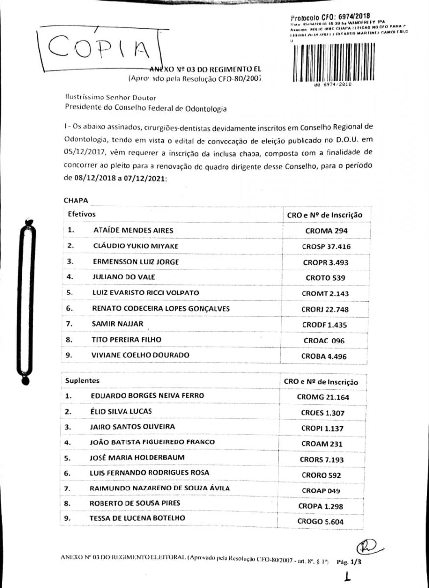 O cirurgião dentista Juliano do Vale continuará na presidência do Conselho Federal de Odontologia (CFO) por mais três anos. Nesta quinta-feira, dia 5, ele registrou a chapa para a renovação do quadro diretivo da entidade máxima da odontologia no Brasil. O pleito, marcado para 4 de junho, terá chapa única, encabeçada por Juliano do Vale, mineiro de Tupaciguara e que vive no Tocantins, então norte de Goiás, há 41 anos. O novo mandato começa no dia 8 de dezembro de 2018 a 7 de dezembro de 2021. “Ao conseguir unir forças e aglutinar um número tão expressivo de apoio dos conselhos regionais e demais entidades, a ponto de termos uma única chapa concorrendo nesta eleição, fica claro que estamos no caminho certo”, afirmou Vale.