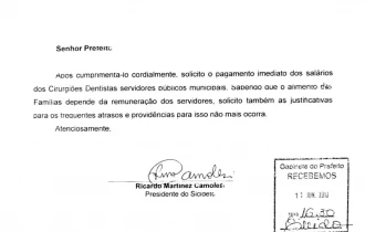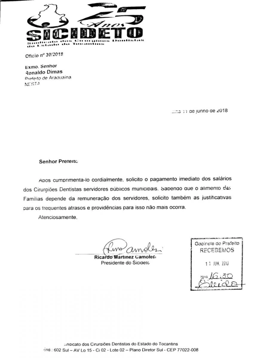 Na tarde desta segunda-feira 11 de junho de 2018, o presidente do SICIDETO, Dr Ricardo Camolesi, pessoalmente protocolou Ofício ao Prefeito Ronaldo Dimas do município de Araguaína, cobrando os salários atrasados dos servidores públicos municipais Cirurgiões Dentistas; salários esses que no ano de 2018 na maioria dos meses não foi recebido até o quinto dia útil do mês como manda a lei.