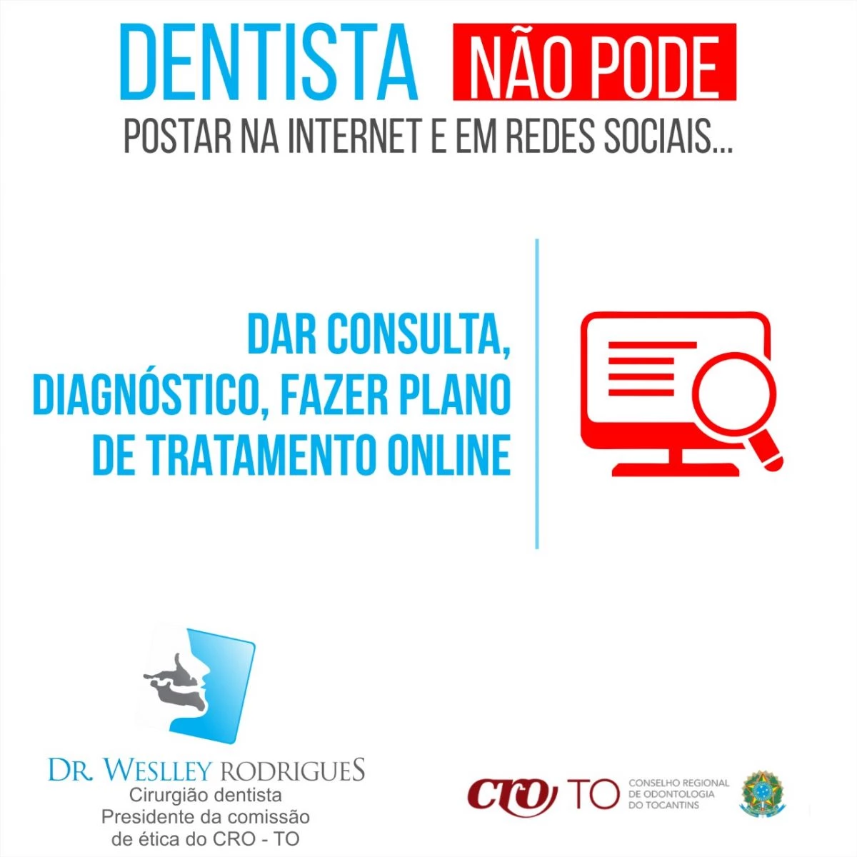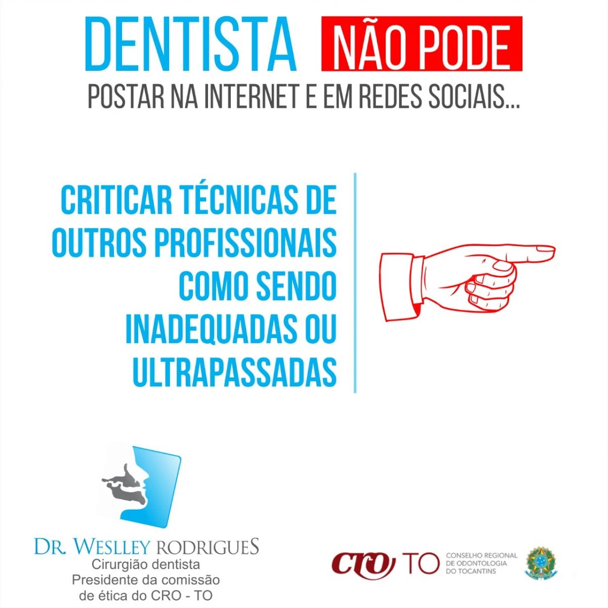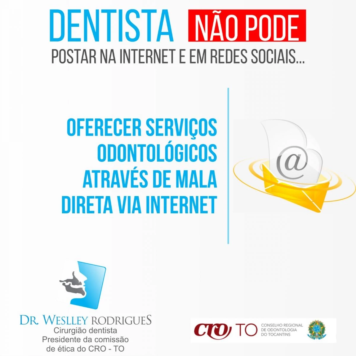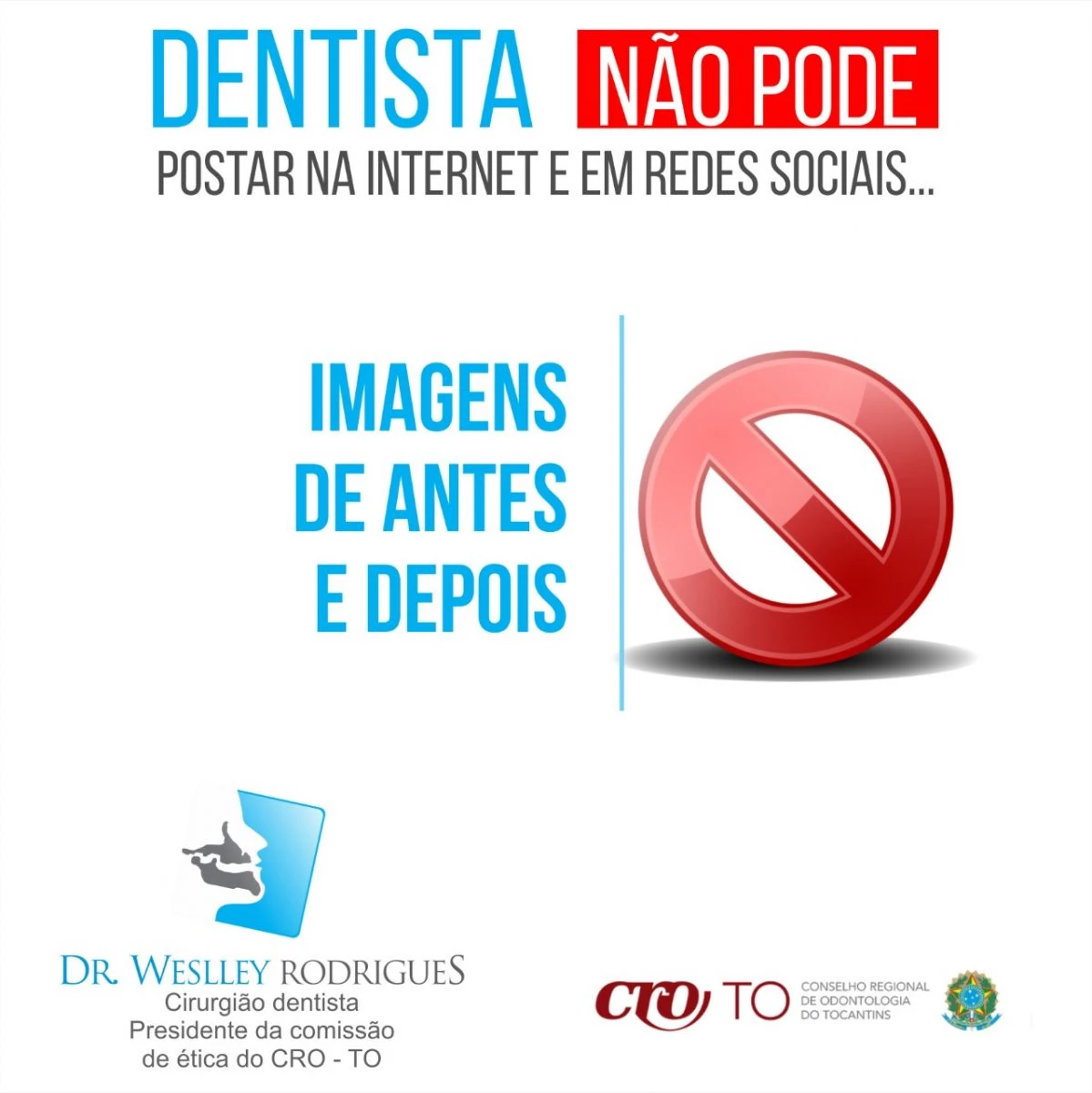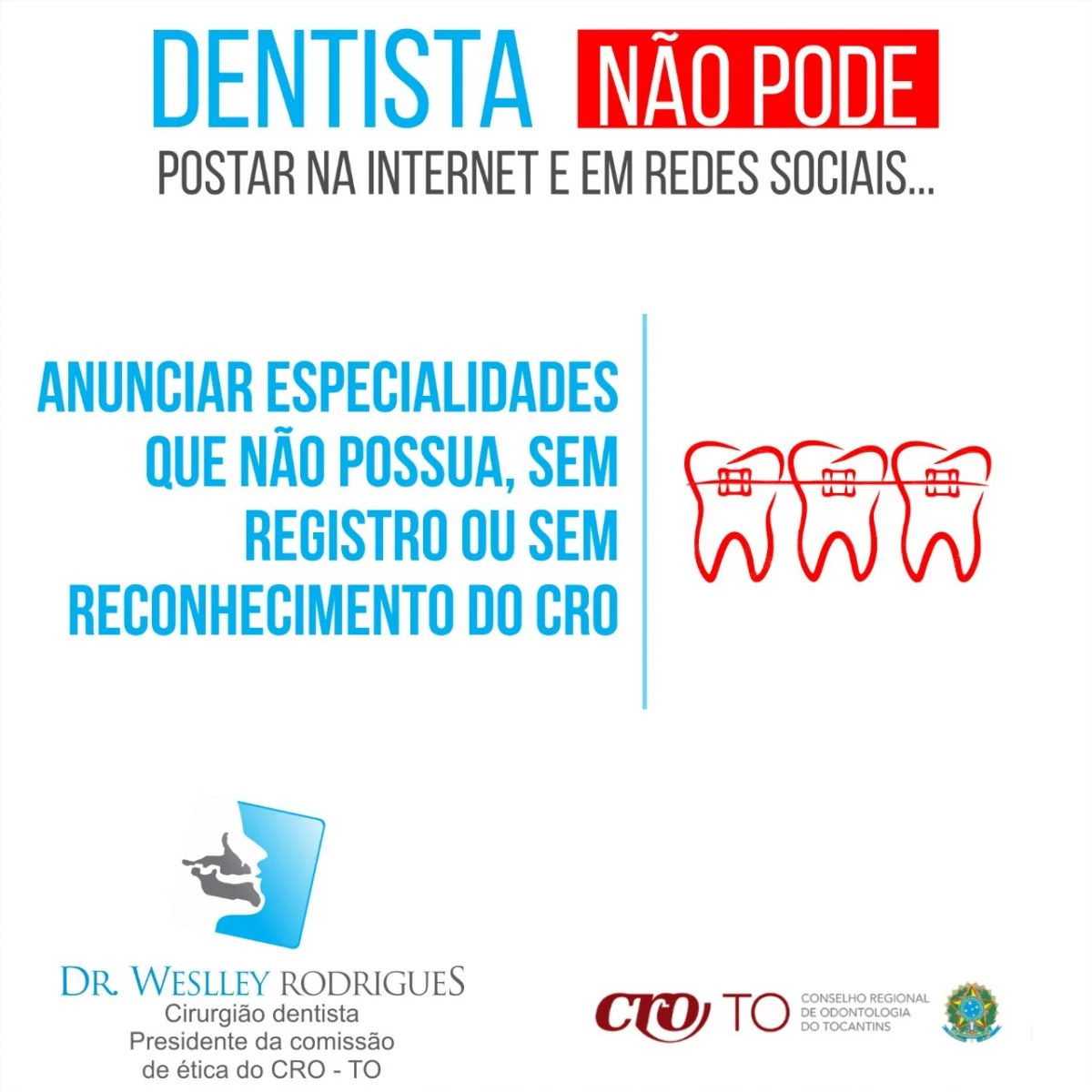 "Esse banner trata-se de uma campanha do CRO-TO para conscientizar e orientar os profissionais sobre publicidade feita nas redes sociais. Lembrando que toda publicação feita pelos profissionais inscritos no conselho de odontologia deverá obedecer os preceitos descritos no código de ética odontológico, e que a não observância desses preceitos gera uma infração ética." Dr. Wesley Rodrigues presidente da comissão de ética do CRO-TO.
