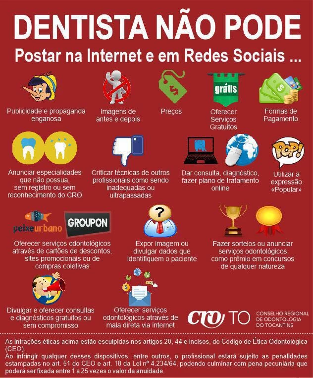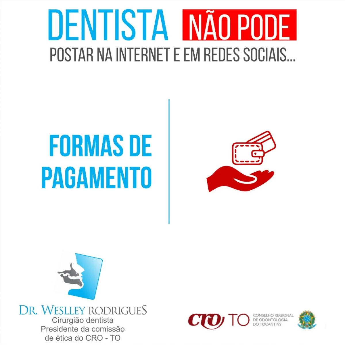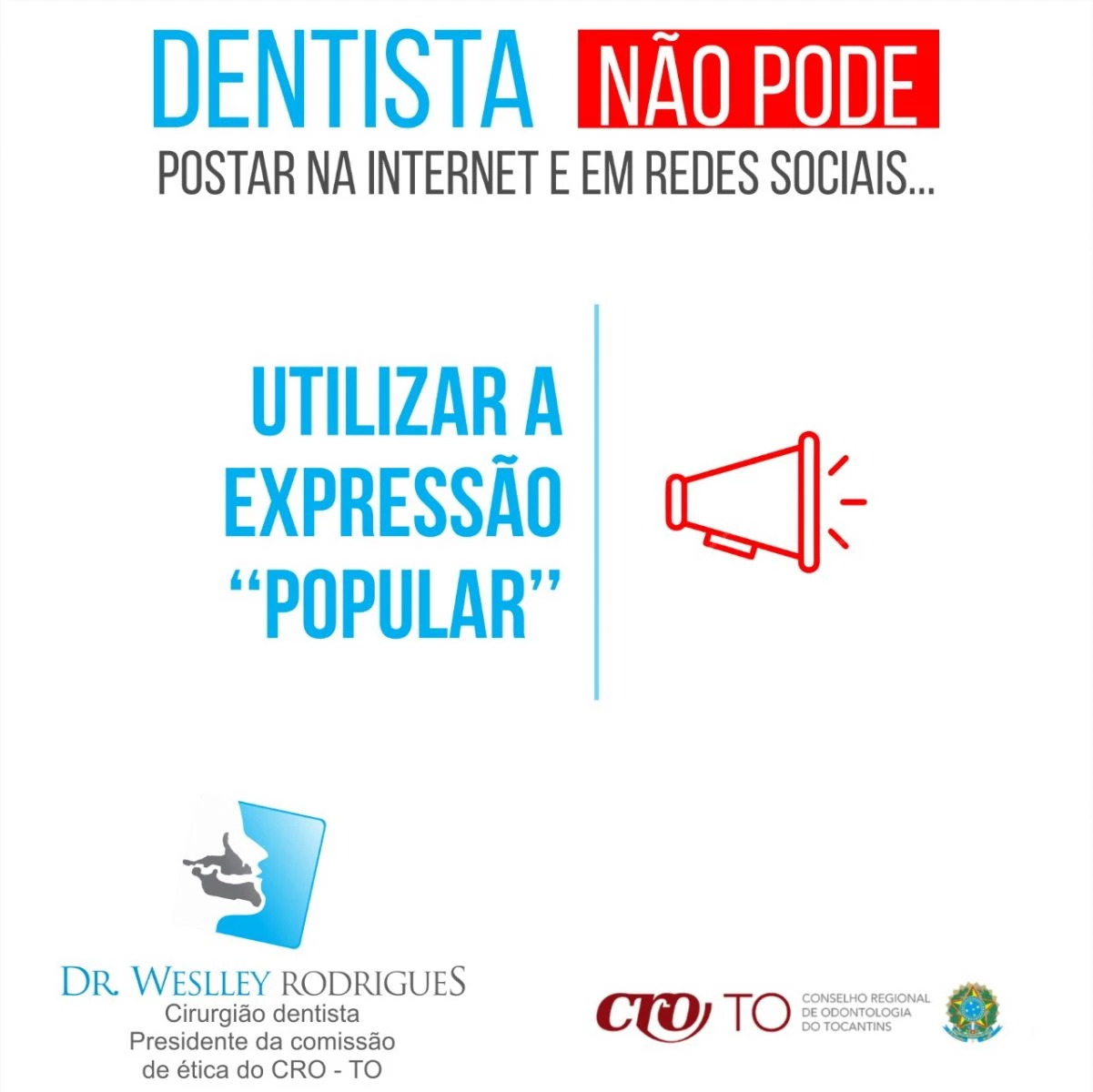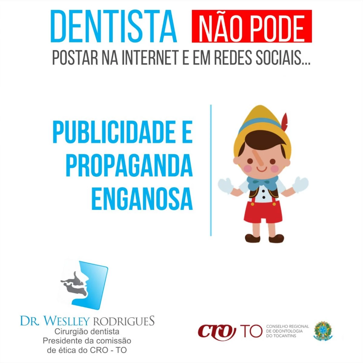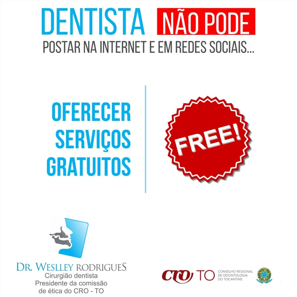 "Esse banner trata-se de uma campanha do CRO-TO para conscientizar e orientar os profissionais sobre publicidade feita nas redes sociais. Lembrando que toda publicação feita pelos profissionais inscritos no conselho de odontologia deverá obedecer os preceitos descritos no código de ética odontológico, e que a não observância desses preceitos gera uma infração ética." Dr. Wesley Rodrigues presidente da comissão de ética do CRO-TO.
