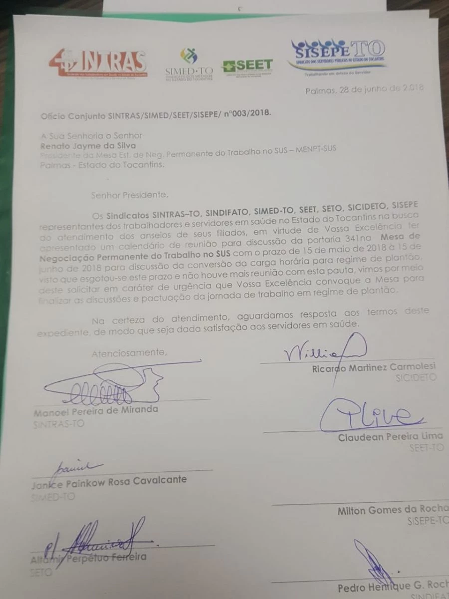Em reunião realizada na tarde desta quinta-feira, 28 na sede do SIMED-TO Sindicato dos Médicos do Tocantins, com a pauta exaustiva da portaria das maldades, as sindicatos foram unânimes em afirmar que se o Governo não tiver o entendimento na forma correta das escalas dos plantões que perfazem as cargas horárias dos servidores públicos estaduais, todos adotarão movimentos no sentido da paralisação/greve. É inadmissível que uma gestão penalize seus servidores tirando direitos, aumentando a carga horária como estão pregando, o Sindicatos estão mostrando maturidade nas negociações, mas a gestão desastrosa e maldita que foi cassada ainda deixa seus rastros.