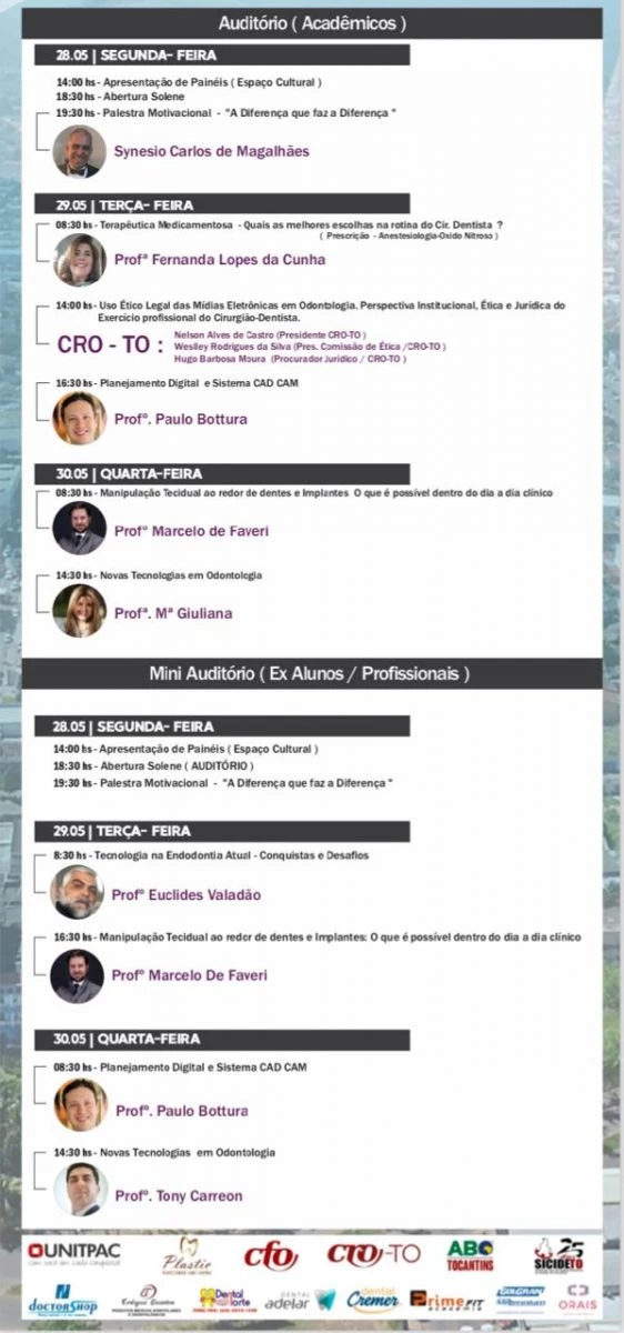 O presidente do Sindicato dos Cirurgiões Dentistas do Estado do Tocantins, Dr Ricardo Camolesi, juntamente com representantes do SICIDETO em Araguaína Diretores do CRO Tocantins e o presidente Dr Nelson Alves de Castro estiveram presentes na cerimônia de abertura da primeira JOIA - Jornada Odontológica do ITPAC. Com mais de trezentos e oitenta participantes a cerimônia realizada com grande sucesso, pois no momento de paralização que o país vive muita dificuldade para locomoção de pessoas e mesmo assim acadêmicos, professores e Cirurgiões Dentistas prestigiaram o evento.