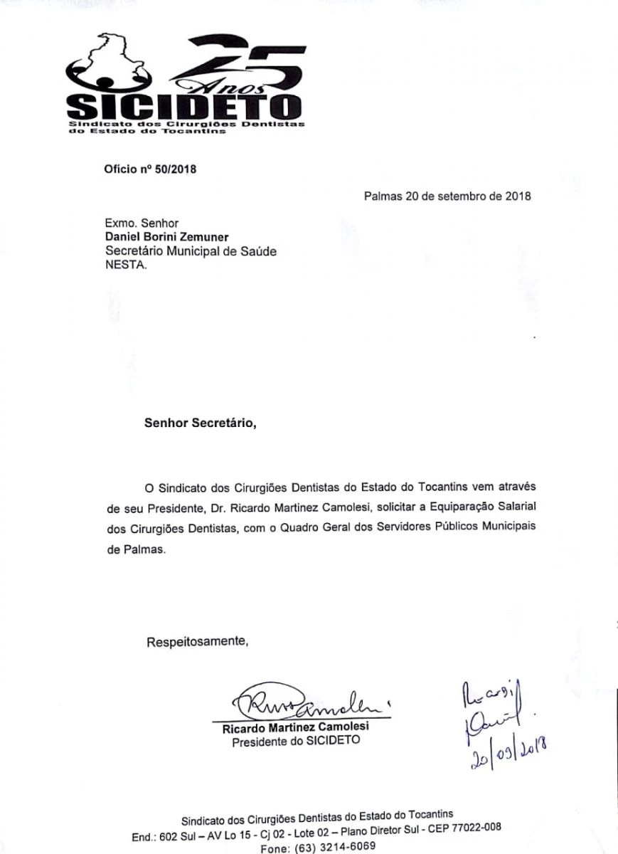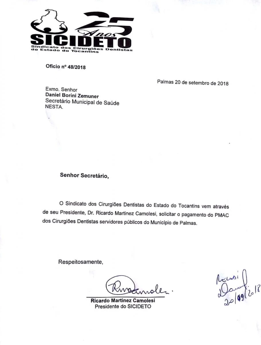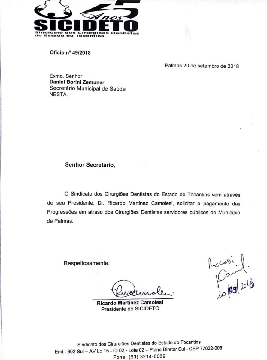 O Secretário municipal da Saúde de Palmas recebeu o SICIDETO nesta quinta-feira pela manhã na SEMUS, com uma pauta extensa para deliberação o Sindicato dos Cirurgiões Dentistas do Estado do Tocantins representado pelo seu presidente Dr. Ricardo Camolesi, e Diretores Dr. Giancarlo Quagliarello, Dr. João Antônio protocolaram os seguintes ofícios: