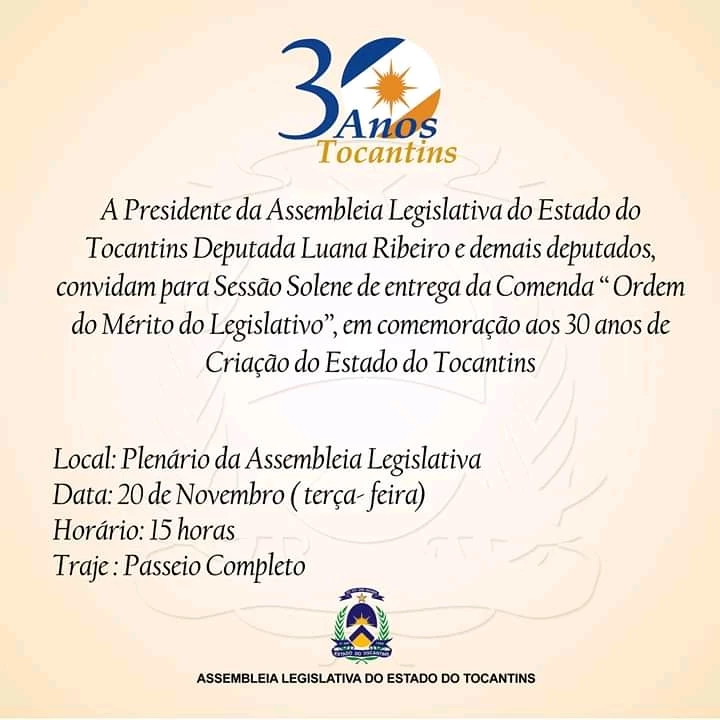 Para a presidente da Casa, deputada Luana Ribeiro (PSDB), lembrou que uma população que se pretenda respeitada, precisa conhecer suas origens. “Quando relembramos nossa história, e homenageamos os homens e mulheres que se destacaram nestes 30 anos – que ajudaram a construir essa história com seu suor, seu trabalho, suas famílias, seus sonhos e que transformaram em realidade o Tocantins de hoje – essa lembrança e esse reconhecimento são uma prova de amor ao Estado e uma forma de retribuir com honraria a uma parte importante dos muitos cidadãos que colaboraram para a criação do Tocantins”.