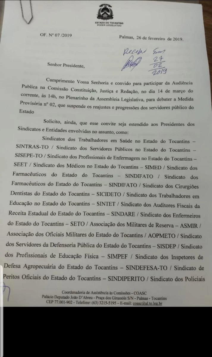 No último dia 18, mais de dez entidades protocolaram um ofício no Palácio Araguaia solicitando ao governador Mauro Carlesse (PHS), que faça alterações na Medida provisória que congela a concessão de vários benefícios aos servidores do Executivo, por um prazo de 30 meses.