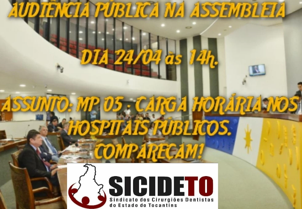 TODOS NA LUTA DIA 24/04/2019 ÀS14h NO PLENARINHO DA ASSEMBLEIA LEGISLATIVA DO ESTADO DO TOCANTINS, AUDIÊNCIA PÚBLICA SOBRE A MP 05, DIVULGUE E PARTICIPE, SUA PRESENÇA É IMPORTANTE OS DEPUTADOS SE SENSIBILIZAM QUANDO EXISTE MOBILIZAÇÃO NA CASA DO POVO .