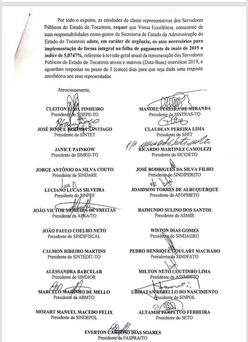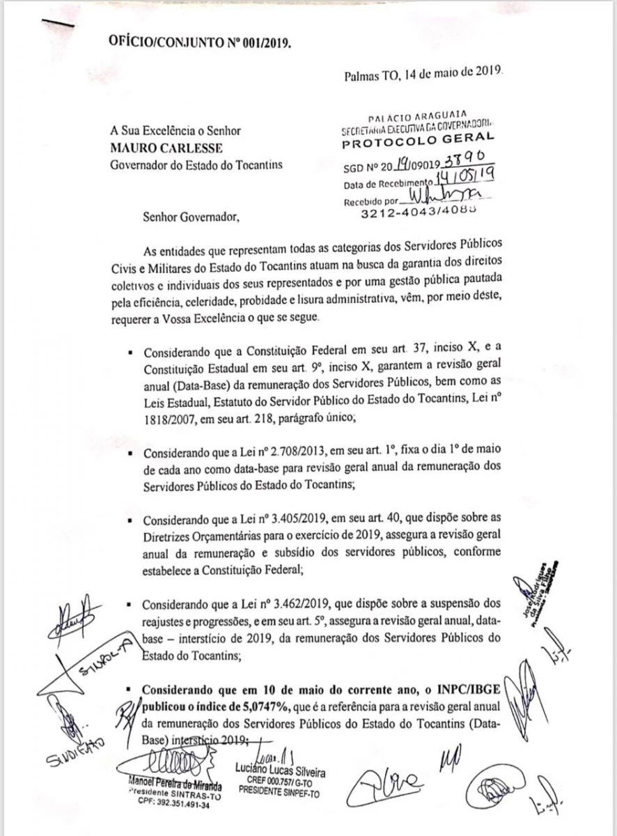 O SICIDETO juntamente com os demais Sindicatos de servidores públicos, trabalhadores do Estado do Tocantins protocolaram na tarde de hoje 14 de março no Palácio Araguaia o documento que segue abaixo: