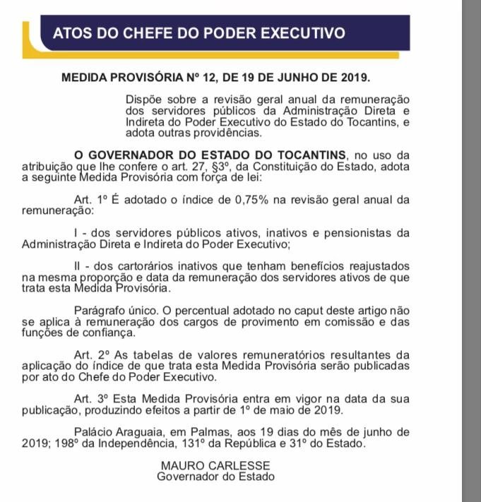 A solicitação baseada em Lei Estadual e Constituições Federal e do Tocantins, foi feita para todos o Servidores Públicos Estaduais, os Sindicatos e Associações de Servidores Públicos Estaduais se basearam no índice de 5,0747% (INPC/IBGE) e agora o Governo vem com a Medida Provisória impondo o índice 0,75%, bem aquém da realidade das perdas salariais dos últimos doze meses (período de abril de 2018 até maio 2019), isso foi uma afronta as negociações iniciadas a mais de trinta dias; todos Sindicatos e Associações de Servidores Públicos Estaduais estão indignados.