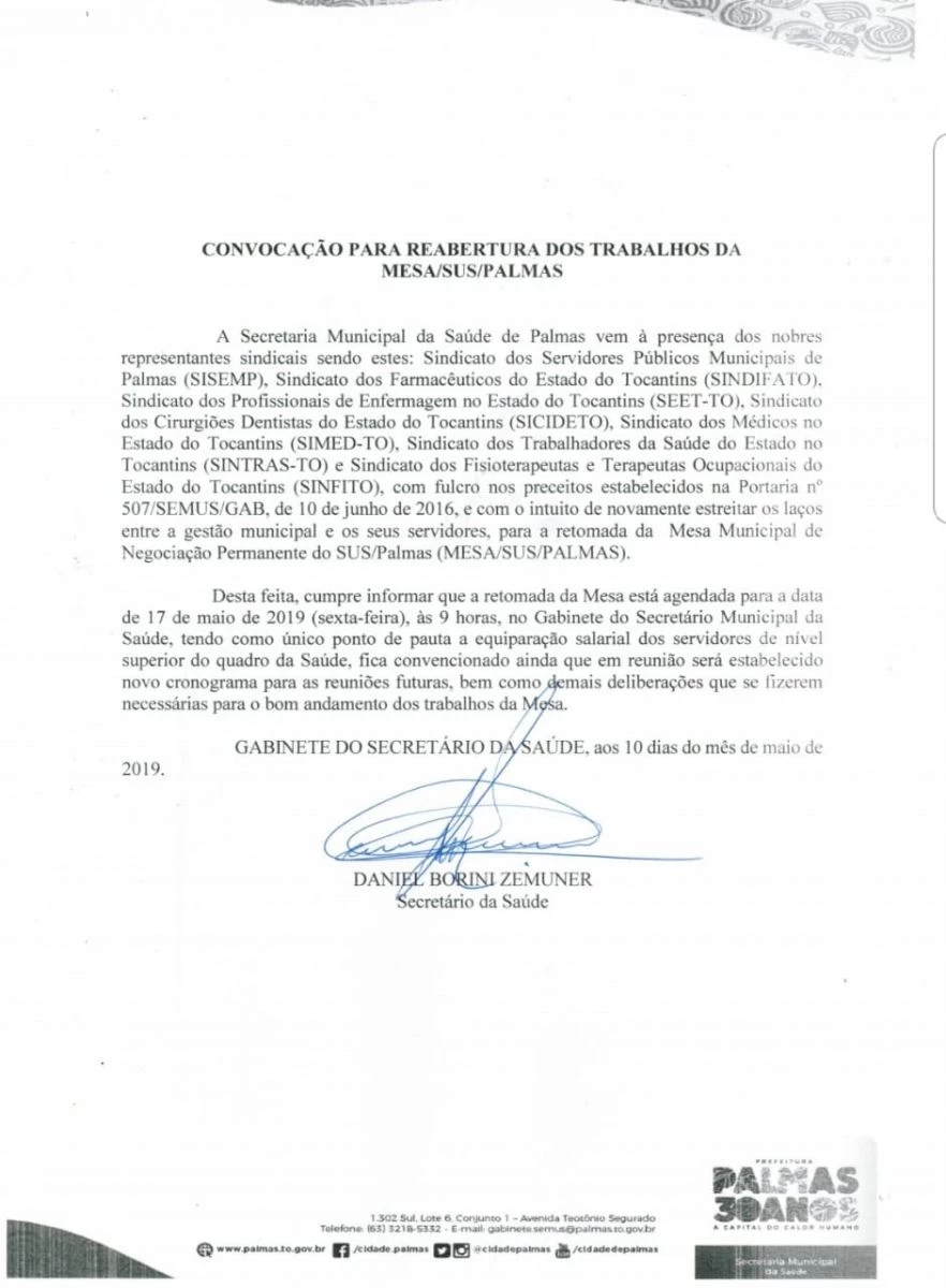 De acordo com a reunião realizada mês passado com o presidente do SICIDETO onde o Secretário Municipal da Saúde de Palmas Daniel Zemuner, fez o compromisso da convocação da Mesa SUS Municipal para apresentar a proposta da Equiparação salarial com o quadro geral do município de Palmas, a reunião será realizada de acordo com o ofício abaixo.