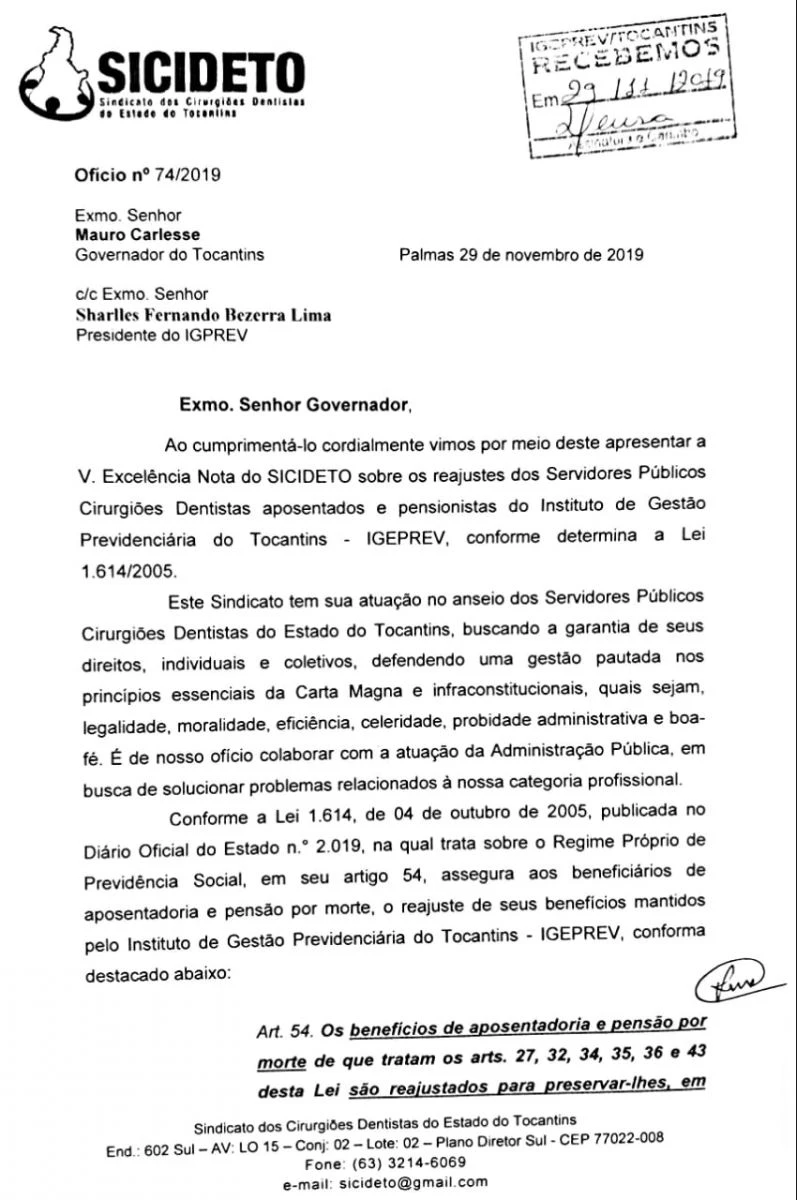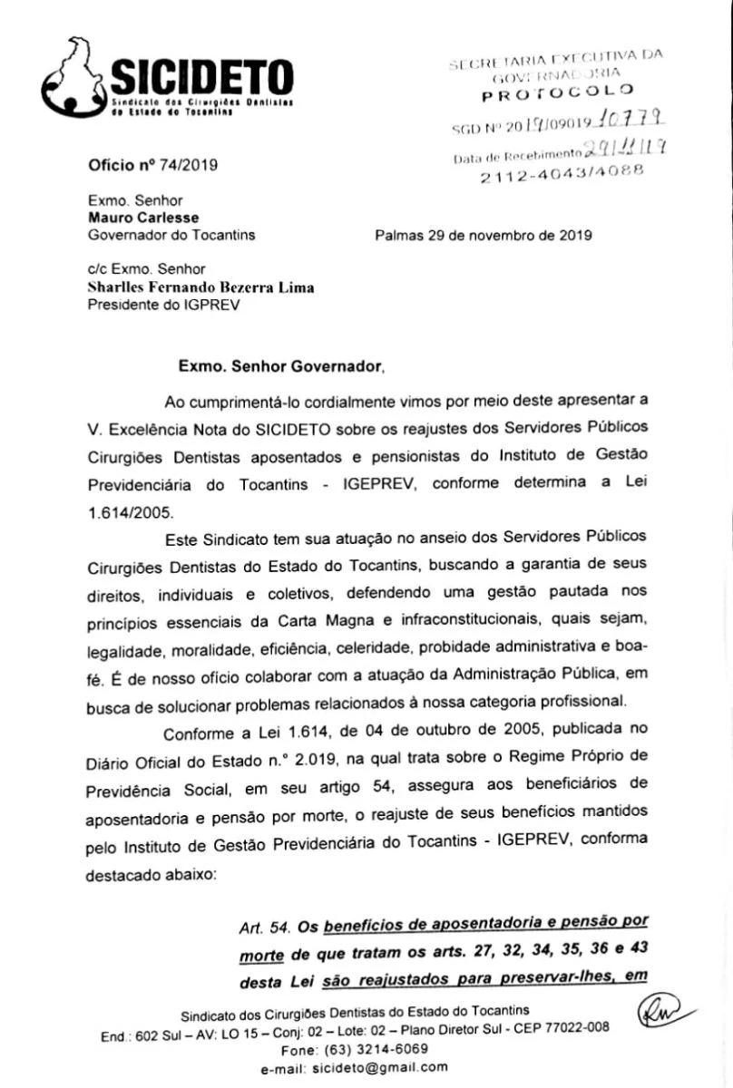 Na manhã desta sexta-feira, 29 de novembro no Palácio Araguaia e na sede do IGEPREV o Presidente do SICIDETO Dr. Ricardo Camolesi esteve pessoalmente protocololando ofício ao Governador Mauro Carlesse e ao Presidente do IGEPREV Sharlles Fernando Bezerra Lima.
