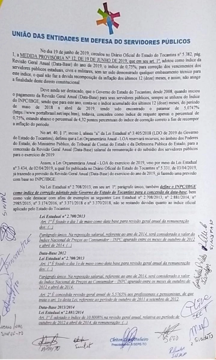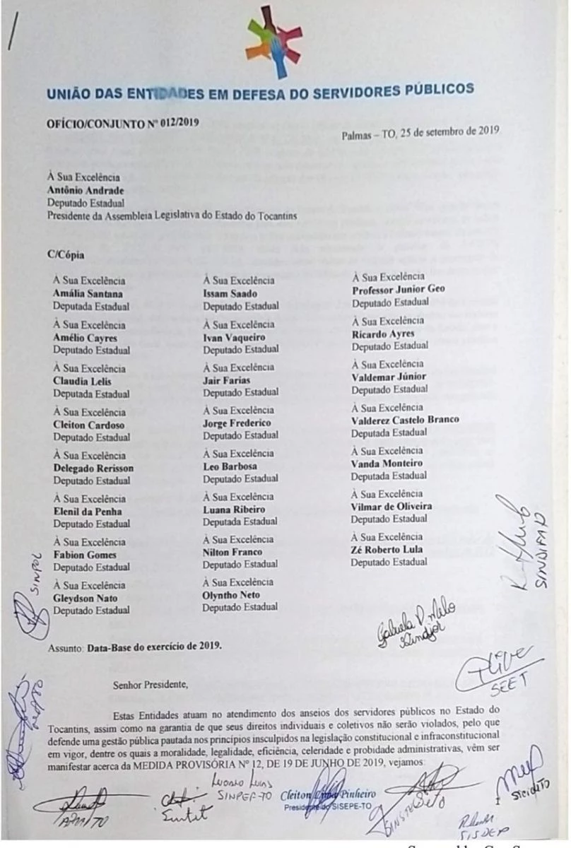Em ofício entregue ao presidente da Casa de Leis, deputado Antônio Andrade (PTB), com cópia para todos os deputados, as Entidades solicitaram, em caráter de urgência, que a Assembleia requeira do Executivo Estadual a imediata edição e encaminhamento à Assembleia de nova Medida Provisória (MP), adotando o índice legal para correção da inflação, ou seja, Data-Base de 5,0747% e não de 0,75% ou 1% para 2019.