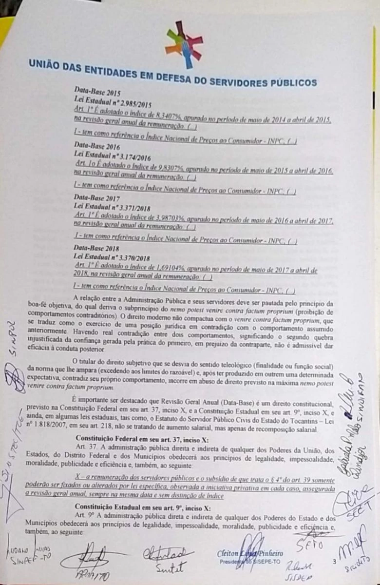 Documento semelhante foi entregue nessa terça-feira, 24, também pelas entidades classistas, a subprocuradora-geral de Justiça, Maria Cotinha Bezerra Pereira, no Ministério Público do Tocantins (MPTO). Na oportunidade, os sindicatos e associações dos militares solicitaram que fosse feita uma recomendação ao governador Mauro Carlesse para que adote o índice legal para correção da inflação, ou seja, Data-base.