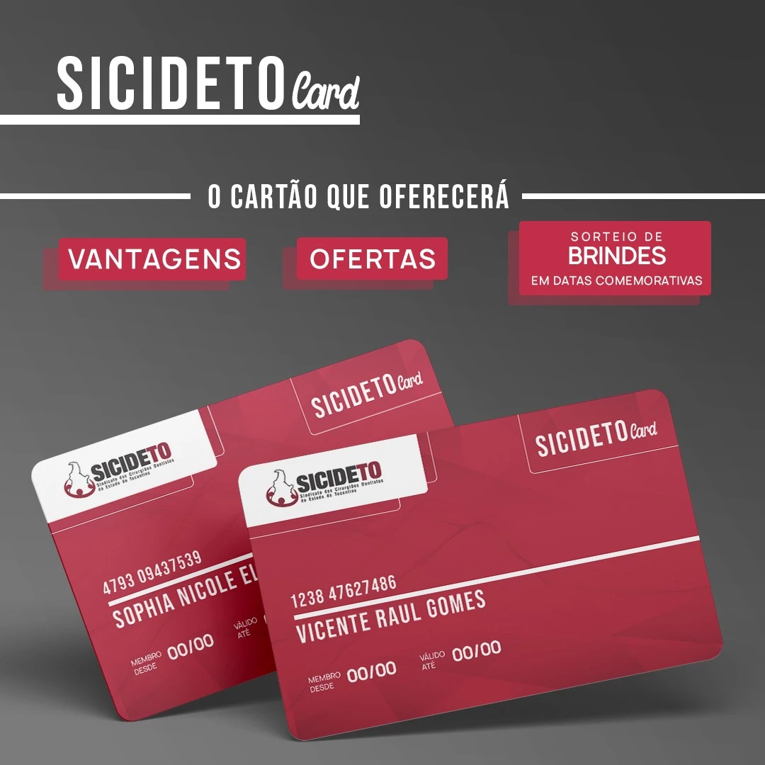 Um cartão de vantagens, ofertas, descontos em estabelecimentos comerciais, que nas datas comemorativas você terá a oportunidade de participação dos sorteios de brindes através de nossas redes sociais no SICIDETO WEB, todo filiado possuirá um cartão com seu número. E mais com o SICIDETO CARD você poderá aderir ao seguro de responsabilidade civil, auxílio funerário (caso filiado venha falecer a família recebe), seguro de vida e muito mais com facilidades incríveis de descontos.