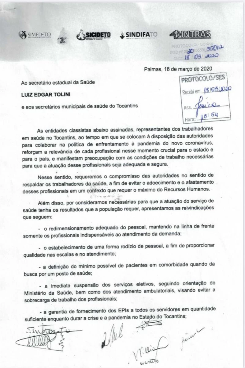 Reunião de urgência na sede do SIMED contou com a presença dos Sindicatos representativos dos Servidores Públicos da Saúde no Estado, SICIDETO, SINTRAS, SIMED, SETO, SINDIFATO e SEET eminitaram um ofício solicitando ao Secretário Estadual da Saúde medidas protetivas aos trabalhadores frente à PANDEMIA do COVID-19. Nosso Sindicato foi representado pelo Diretor Willian Gilvander.