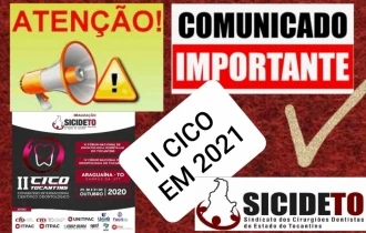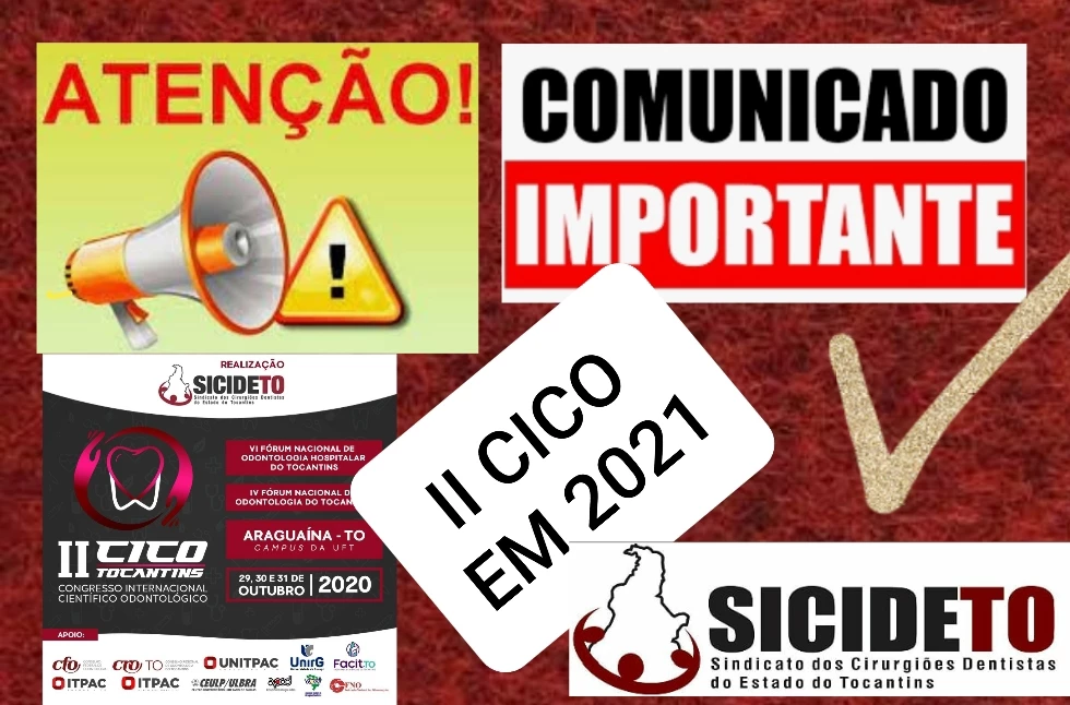 A DIRETORIA DO SICIDETO E COMISSÃO ORGANIZADORA DO II CICO, VI FÓRUM NACIONAL DE ODONTOLOGIA HOSPITALAR DO TOCANTINS, IV FÓRUM NACIONAL DE ODONTOLOGIA DO TOCANTINS, COMUNICAM A TODOS QUE DEVIDO À PANDEMIA OCORRERÁ A MUDANÇA DE DATA, FICANDO PARA O PRÓXIMO ANO, PARA SEGUNDA QUINZENA DE MAIO 2021 NOS DIAS 27, 28 E 29.