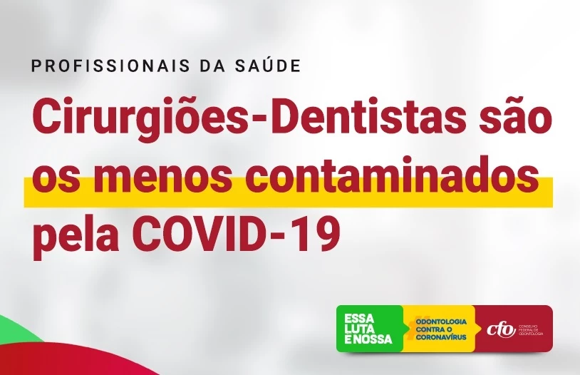 O Conselho Federal de Odontologia (CFO) informa que Cirurgiões-Dentistas, Auxiliares e Técnicos em saúde bucal, representam o menor índice de contaminados entre os profissionais da saúde que estão na linha de frente contra a Covid-19; número de profissionais da Odontologia infectados também está abaixo da média nacional da população. A rápida atuação do CFO foi decisiva para esse cenário, em virtude da suspensão do atendimento eletivo na rede pública de saúde e do fortalecimento no rigor da biossegurança em procedimentos odontológicos.