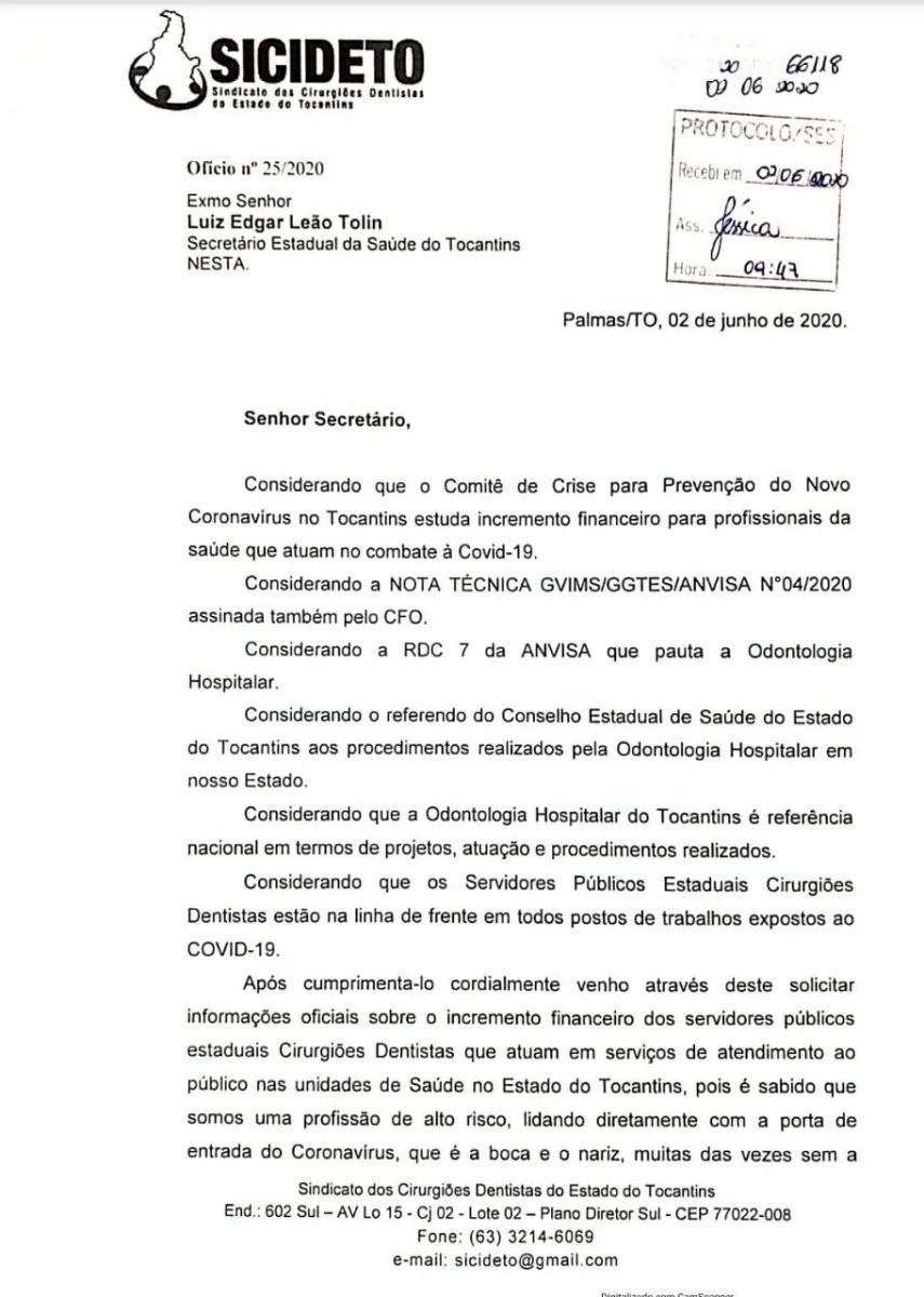 O SICIDETO protocolou ofício ao Secretário Estadual de Saúde, pois percebe que os Cirurgiões Dentistas do Estado em nenhum momento foram lembrados pelo Governo e como estão presentes na linha de frente cabe ao Sindicato representante da Categoria perguntar oficialmente o motivo.