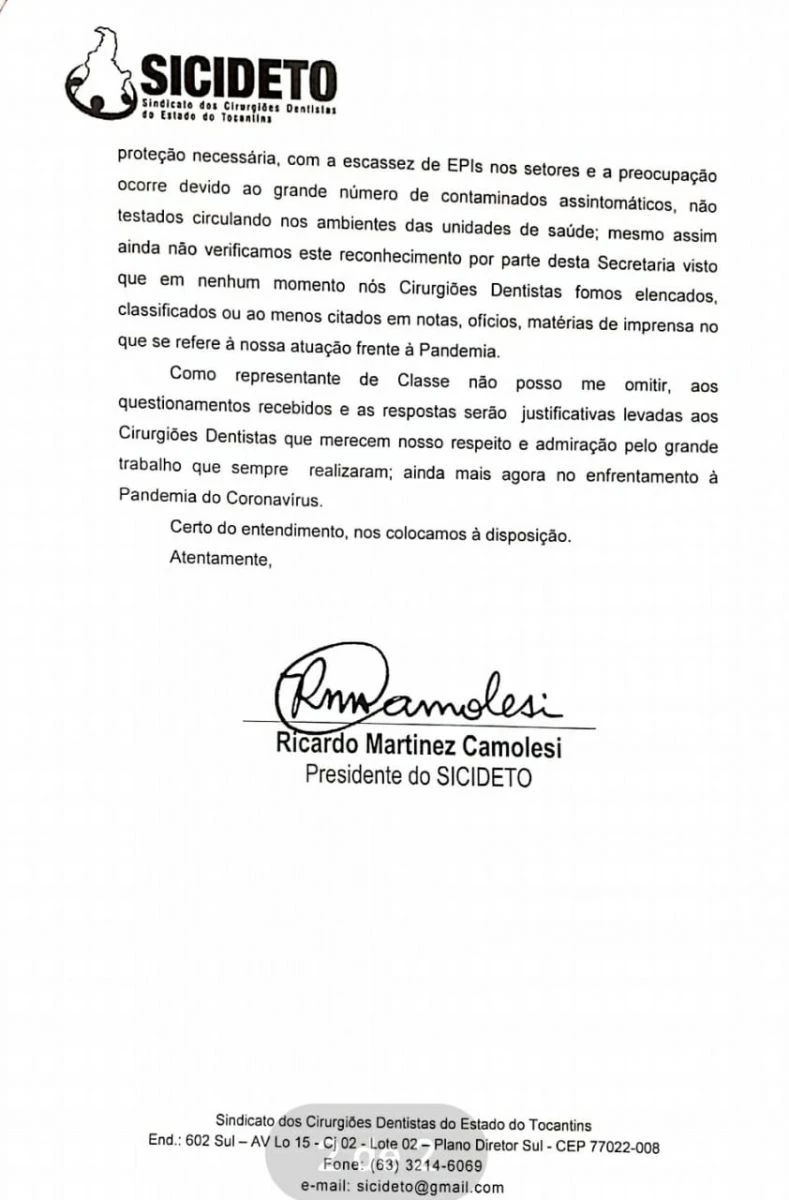 " Agora com a Pandemia em curso a comunicação com a SES que era difícil ficou um pouco mais, não percebo interesse por parte da Gestão em aprimorar as ações na área odontológica, visto o que foi noticiado semana passada, em que vários municípios do Tocantins perderam recursos para o LRPD, sabemos que as responsabilidades são divididas nas três esferas de Governo, mas Estado tem muitas responsabilidades na saúde bucal, e momentaneamente deixa muito a desejar em todos aspectos, continuaremos cobrando" Conclui Dr. Ricardo Camolesi PRESIDENTE DO SICIDETO.