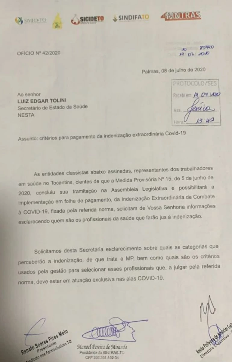 O SICIDETO conjuntamente com os demais Sindicatos da Saúde SIMED, SINTRAS, SETO E SINDIFATO preocupados com a indenização extraordinária do COVID- 19 prometida pelo Governo, protocolou ofício solicitando respostas oficiais do Secretário Estadual de Saúde, Sr. Luiz Edgar Tolini.