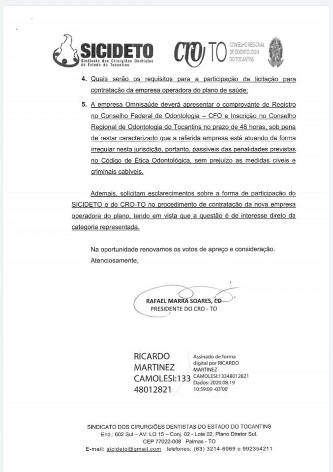 O Departamento Jurídico do SICIDETO com a resposta em mãos fará uma análise detalhada e providências serão tomadas, lembrando a todas e todas que o Sindicato representa junto ao Estado do Tocantins todos os CIRURGIÕES-DENTISTAS nesta negociação, as medidas cabíveis ao Conselho Regional de Odontologia do Tocantins / CRO-TO, serão encaminhadas para que tudo ocorra dentro da legislação vigente, "não existe Empresa prestar serviços odontológicos sem estar inscrita no CRO-TO, daremos muito atenção a este item, com certeza " completou o presidente Camolesi.