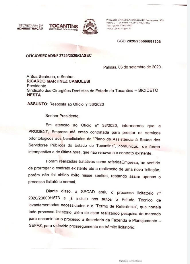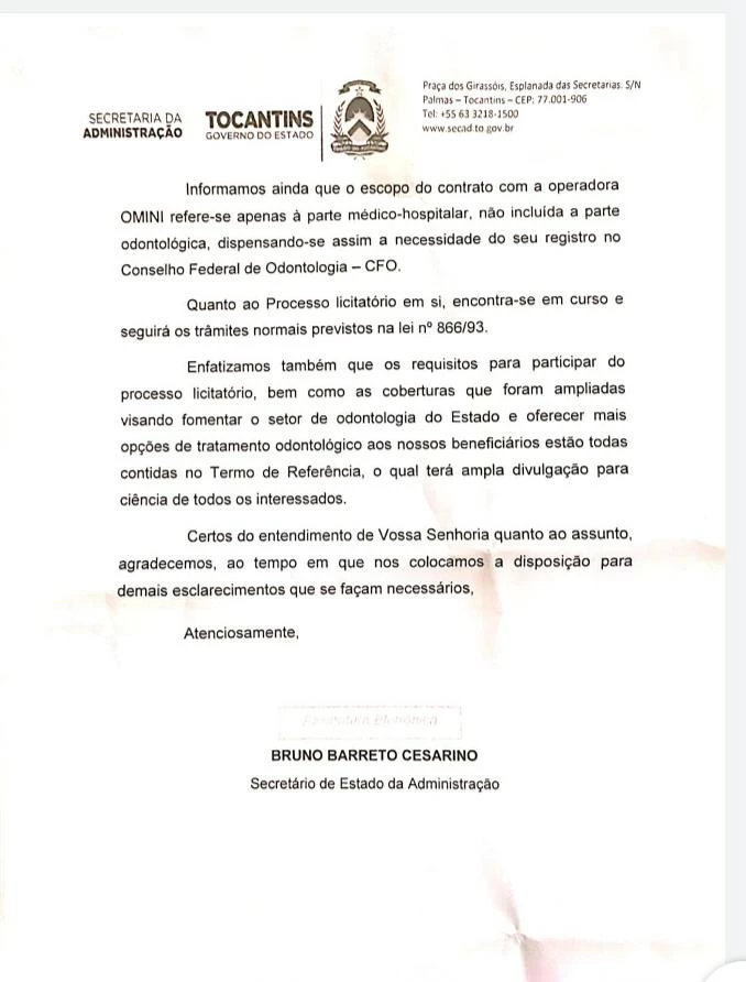Em resposta ao ofício conjunto SICIDETO/CRO-TO, o Secretário de Administração do Estado Sr. Bruno Cesarino, explicando os motivos pelos quais os atendimentos do Plansaúde Odontológico foram suspensos.