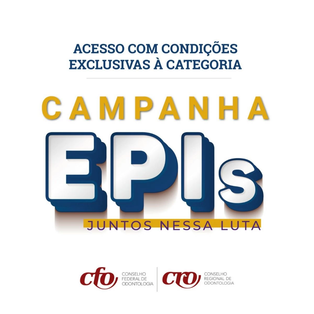 O Conselho Federal de Odontologia (CFO) lança nesta sexta-feira, dia 26 de fevereiro, a “Campanha EPIs – Juntos Nessa Luta ”, com benefícios exclusivos à categoria para acesso de Equipamentos de Proteção Individual (EPIs). A partir de agora, inscritos em situação ativa e regular junto ao Sistema CFO/CROs podem adquirir luvas, máscaras cirúrgicas, jalecos descartáveis, protetores faciais, entre outros itens com condições especiais.