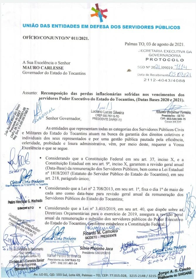 Em busca de atender os anseios de sindicalizados e associados, 19 Entidades Classistas, protocolaram nesta quinta-feira,05, no Palácio Araguaia, o ofício conjunto Nº 11/2021 cobrando a recomposição das perdas inflacionárias sofridas nos vencimentos dos servidores do Poder Executivo do Estado do Tocantins, (Datas-Bases 2020 e 2021).