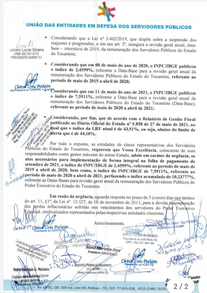 As Entidades cobram do governador Mauro Carlesse a implementação integral na folha de pagamento no mês setembro de 2021 referente ao índice do INPC/IBGE de 2,4599% referente aos períodos de maio de 2019 a abril de 2020, bem como, o índice do INPC/IBGE de 7,5911% referente aos períodos de maio de 2019 a abril de 2020, perfazendo o índice acumulado de 10,23777%, referente às datas bases para revisão geral anual da remuneração dos servidores públicos do Poder Executivo Estadual.