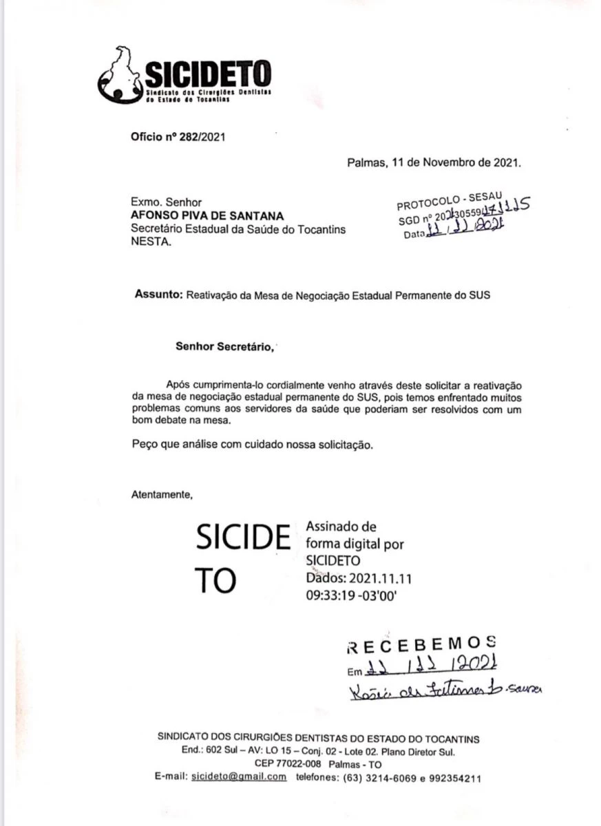 Dr. Ricardo Camolesi esteve com o Robson Silva, Diretor da Regulação do Trabalho - SES discutindo sobre a reativação da Mesa de Negociação Permanente do SUS, local onde os Sindicatos e Gestão tratam dos assuntos referentes aos servidores públicos estaduais e demandas da saúde de modo em geral, devido ao grande número de reclamações sobre inconsistências referentes ao grau de insalubridade dos Cirurgiões-Dentistas, o SICIDETO procurou a Diretoria e foi sugerida a reativação da MESA SUS, ofício será protocolado para formalização da proposta.