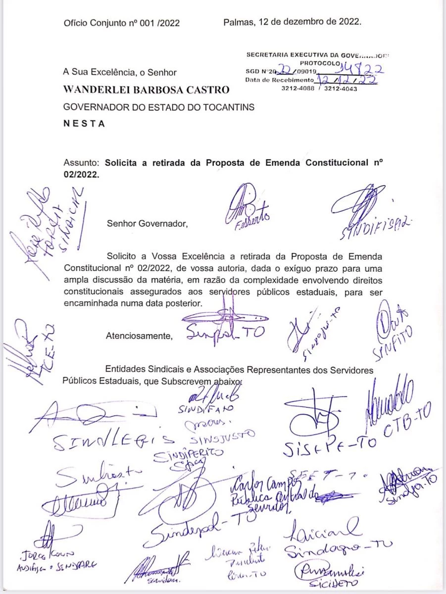 Grupo de representantes sindicais protocolou no final da tarde desta segunda-feira o seguinte ofício:
