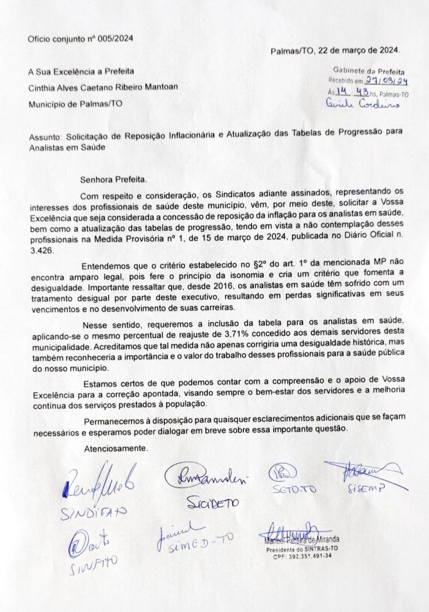 Diante da falta de compromisso por parte da Gestão municipal de Palmas, junto aos servidores de nível superior fazendo com que a LEI não seja cumprida com isonômia, o SICIDETO juntamente com as Entidades Sindicais protocoplaram ofício.