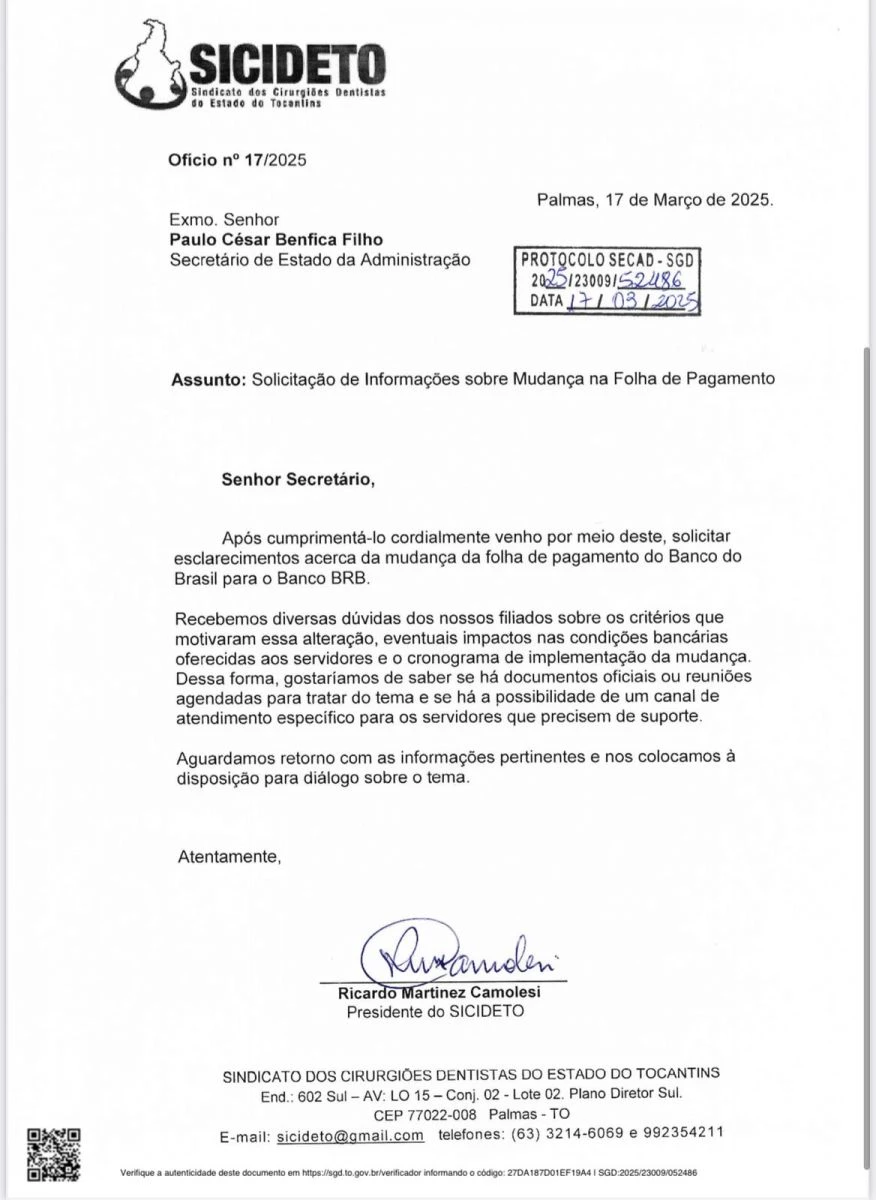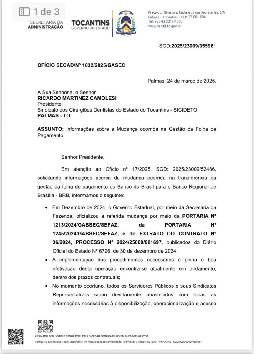 Em resposta ao Ofício nº 17/2025, enviado pelo SICIDETO à Secretaria de Administração, a Secretaria da Fazenda do Estado informou sobre a transferência da gestão da folha de pagamento dos servidores públicos estaduais do Banco do Brasil para o Banco Regional de Brasília (BRB).