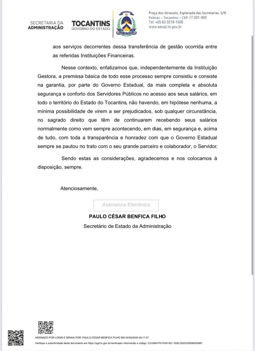 Um dos principais pontos destacados pela Secretaria é que, independentemente da instituição financeira responsável pela gestão da folha de pagamento, o Governo Estadual reafirma seu compromisso com a segurança e regularidade dos pagamentos dos servidores. Em nenhuma hipótese, os servidores serão prejudicados no recebimento de seus salários, que continuarão sendo pagos pontualmente e com toda a transparência que caracteriza a administração estadual.