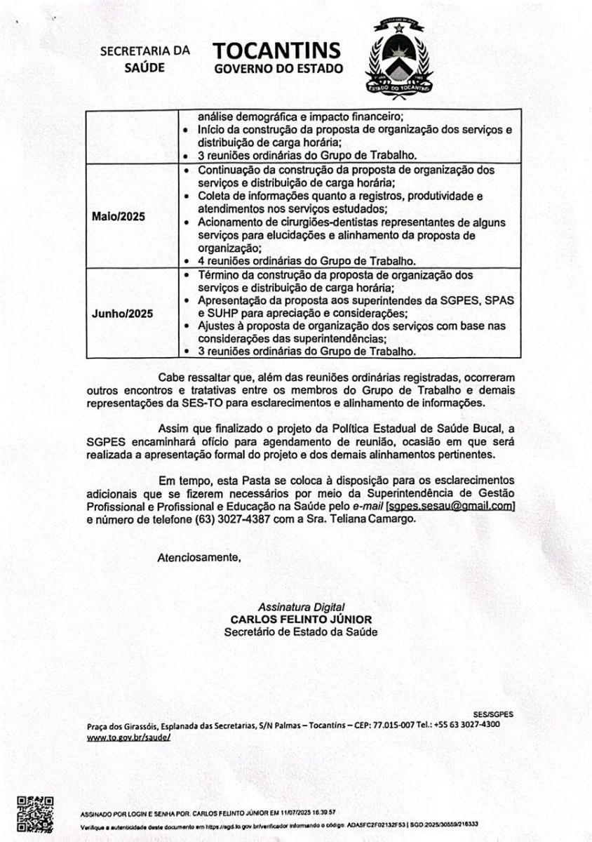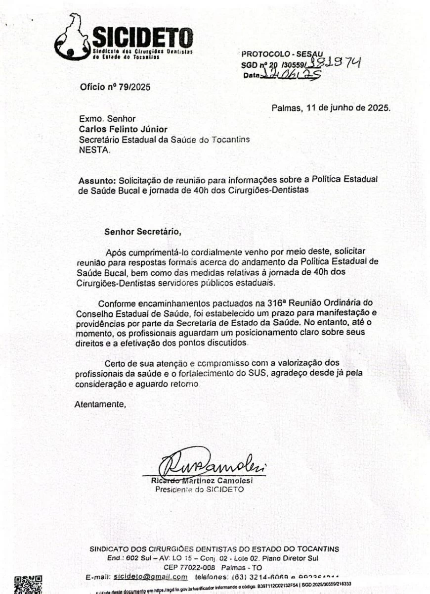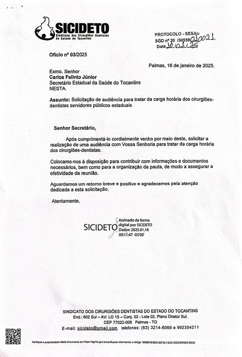 Desde o início do ano de 2025 o SICIDETO vem provocando a SES - Secretaria Estadual de Saúde a prestar esclarecimentos sobre a PESB - Política Estadual de Saúde Bucal e o ajustamento da carga horária para 40 horas dos servidores públicos estaduais injustiçados.