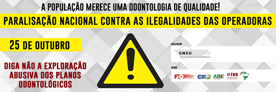 A Comissão Nacional de Convênios e Credenciamentos (CNCC) composta pelas Entidades Odontológicas Nacionais – ABCD, ABO-Nacional, CFO, FIO, FNO -, convocam os profissionais da classe para a 5ª Paralisação Nacional contra os abusos e ilegalidades das Operadoras de Planos Odontológicos, no dia 25 de outubro – Dia do Cirurgião-Dentista. A mobilização contará também com o apoio das Comissões Estaduais de Convênios e Credenciamentos (CECCs).