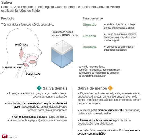 A saliva ajuda na digestão, defende o organismo de contaminações e ainda tem um papel importante na cicatrização e limpeza da boca, além de ser fundamental para o paladar. No entanto, a importância dela só é percebida quando há falta, o que pode indicar vários problemas de saúde, como explicaram o cirurgião do aparelho digestivo Fábio Atui e o dentista Gustavo Bastos no Bem Estar desta quarta-feira (19).