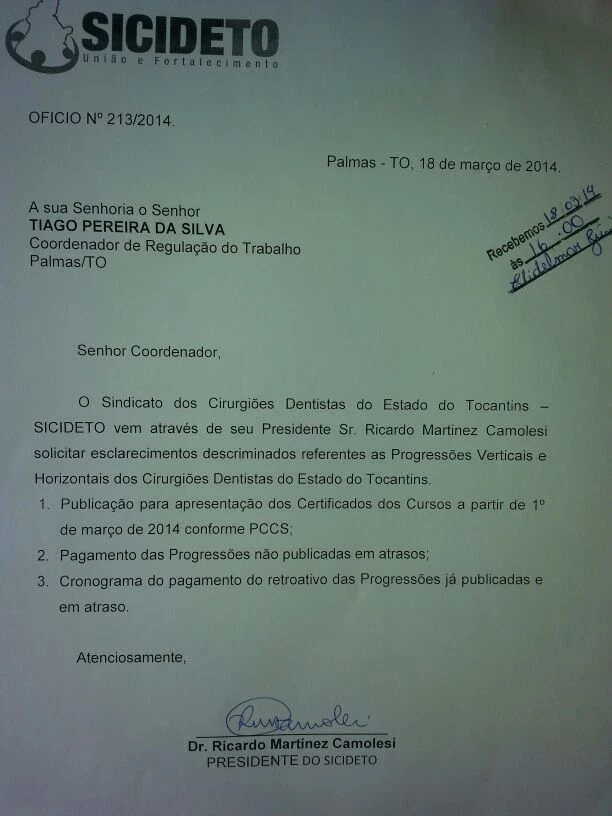 Correspondendo o interesse de toda Categoria em buscar esclarecimentos referentes às Progressões Verticais e Horizontais dos CD’s do Estado do Tocantins, o Sicideto protocola ofício junto à Coordenação de Regulação do Trabalho.