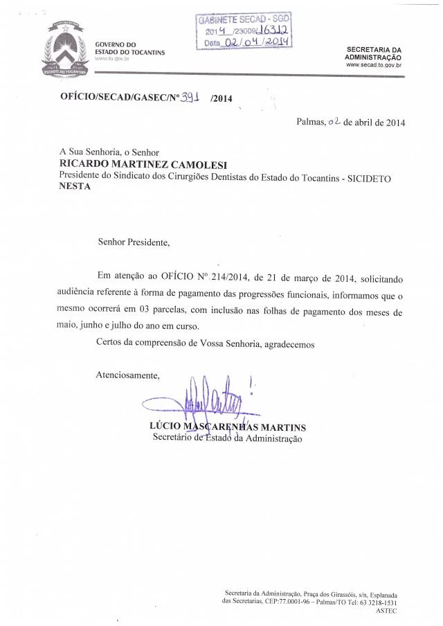 O Secretário Estadual de Administração (Secad), respondeu, nesta quinta-feira, 03, o Ofício nº 214/2014, protocolado pelo Sindicato dos Cirurgiões Dentistas do Estado do Tocantins (Sicideto), que solicitava audiência para discutir a forma de pagamento das Progressões atrasadas já publicadas.