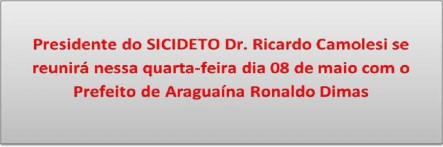 O Presidente do Sicideto Ricardo Camolesi agendou para o dia 08 de maio pela manhã, que contara com a presença do Presidente do CRO-TO e secretária geral do CFO. Serão discutidos assuntos referentes aos Cirurgiões(ãs) Dentistas concursados do município de Araguaína, entre eles PCCR, Insalubridade, Carga horária e condições de trabalho.